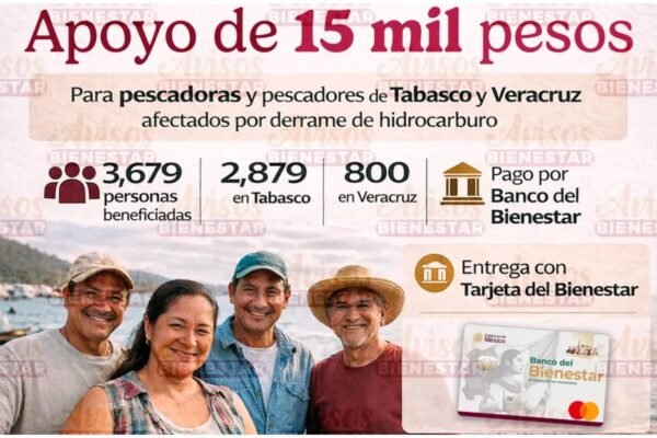 La Comisión Nacional de Acuacultura y Pesca (Conapesca) informó que, a partir de este lunes 6 de abril, inicia la dispersión de apoyos económicos del programa Bienpesca, mediante el cual se entregarán 15 mil pesos a cada uno de los 3 mil 379 pescadoras y pescadores de los estados de Tabasco y Veracruz afectados por la presencia de hidrocarburo en el…